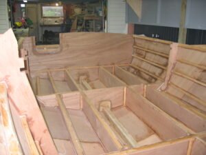 The quality and “trueness” of the floor upon which the base sits: Basically, the question you are trying to answer is “How much shimming does it take to make the base perfectly flat. If the floor is reasonably flat and simply not level, then 2×4 lumber should be sufficient for boats under 36 feet. It might even be appropriate for bigger boats. If, on the other hand, a great deal of shimming is required, then it is likely that heavier lumber (2×6, 2×8) should be used. When in doubt, give us a call. We will be happy to help you decide. Remember, the base is the starting point for the quality of the boat.