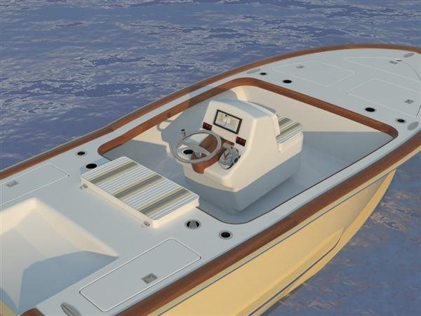 We designed this hull to be multi-purpose, so we gave her two distinctly different running surfaces. This version is the "Bay" model. She has some deadrise when compared to the "Flats" model. She will be a tender, a fishing boat and, we are told, the kids are going to even use her for a little water skiing and wake boarding.