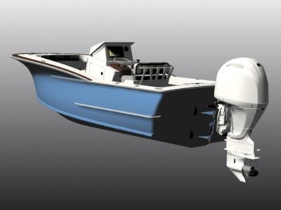 We designed this hull to be multi-purpose, so we gave her two distinctly different running surfaces. This version is the “Bay” model. She has some deadrise when compared to the “Flats” model. She will be a tender, a fishing boat and, we are told, the kids are going to even use her for a little water skiing and wake boarding.